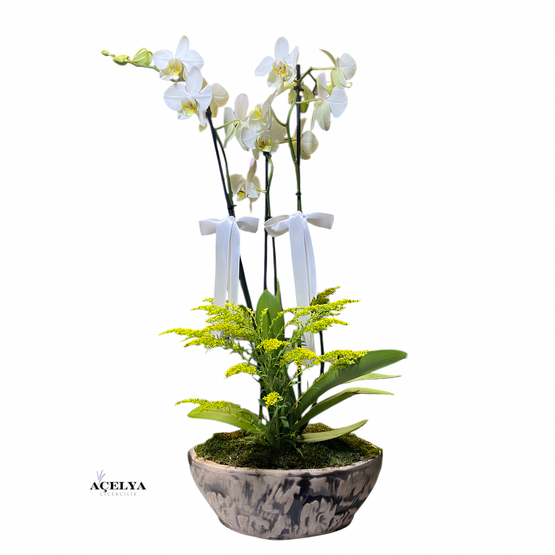 Seramik Kayık Saksıda Çift Dal Beyaz Orkide